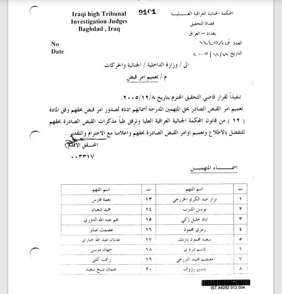 هەروەها "لە رێكەوتی 21-12-2005, بە پێی نوسراوی دادگای باڵای تاوانەكان ژمارە ف2 1474, داوای ناوی سیانی و ناونیشانی 18 تاوانبار دەكات كە بریتین لە" سەعید مەحمود باریكە, عەدنان جەباری, شێخ رەئوف, شێخ جەعفەر 164-جعفر عبدالكریم البرزنجی محافز السلیمانیە, شێخ رەمەزان, قاسم دڕەیی, جیهان موسا, معتەسەم بەرزنجی, رەفعەت گلی, یاسین رەئوف, غەسان شێخ سەعید, تەحسین شاوەیس 409-تحسین شاویس سعید , شێرزاد ساڵەح, قاسم ئاغای كۆیە 115-المستشار (قاسم فارس تاهر مصتفی اغا) ف د و /, تۆفیق جەبار قارەمان, بایز عەبدالڕەحمان, حوسێن شێخ سەعید, عەلی ئەحمەد رەشید, حوسێن حەمە ئینجە".