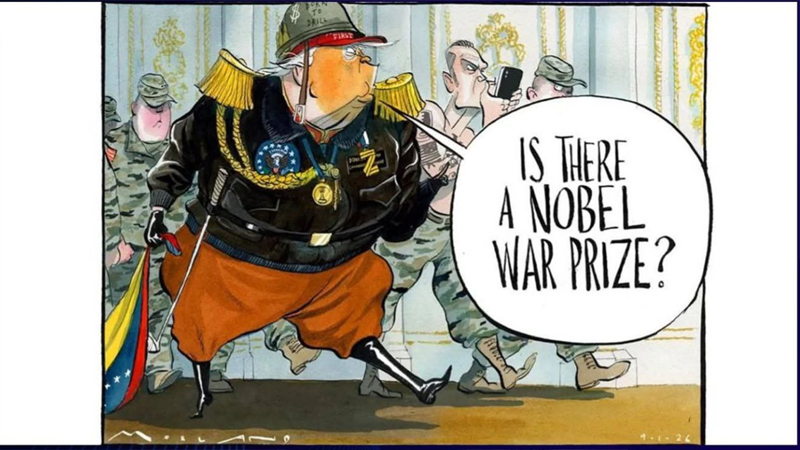 ساڵی ڕابردوو دۆناڵد تڕەمپ خەریک بوو قورگی خۆی دەدڕاند و بە جیهانی دەوت: «بۆچی نۆبڵی ئاشتی بە من نادەن؟»، وەک ئەوەی خەڵاتەکە "مەساسە،و،نوقڵ" بێت و لەبەر چاوی ئەو بە منداڵێکی تر درابێت. وا دیارە ئەمساڵ تاقەتی چاوەڕوانیی نەما و بڕیاری دا بە شێوازی خۆی "ئاشتی" بەسەر ڤەنزوێلادا دابەش بکات؛ بە فڕۆکەی جەنگی و مووشەکی کروز!